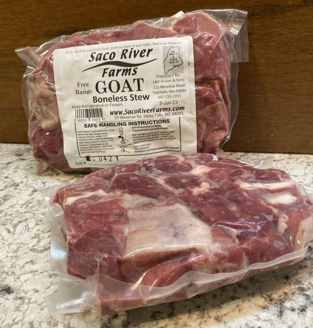 Saco River Farms Goat Boneless Stew meat can be used for goat curry, a hearty stew or soup. An easy substitute for any recipe calling for boneless stew beef.